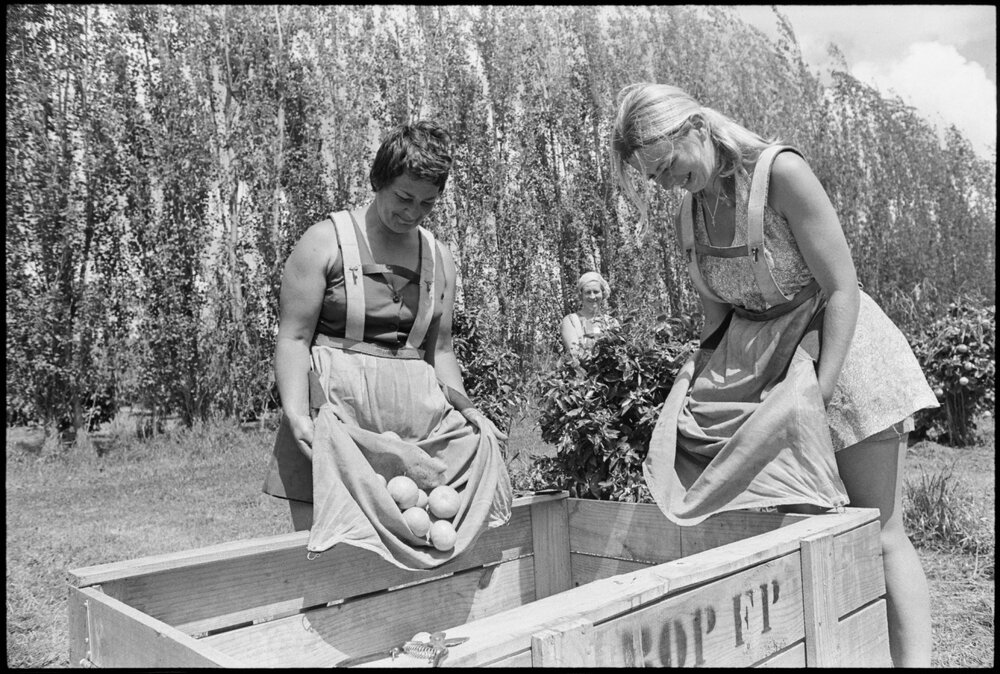 Date11 November 1975Reference Numberphoto gcc-36672Description1975 Fruitgrowers field day. Emptying tangelos into a crate ready for sorting and packing is Mrs Marie Hill of Ōmokoroa. The fruit pickers will be a part of the field day display as they carry out their work. Published 11 November 1975.FormatNegativePhysical Description35mm black-and-white negative (4/6)Photographer/CreatorBay of Plenty Times