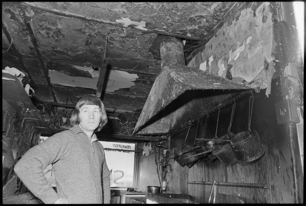 Date11 November 1975Reference Numberphoto gcc-36676DescriptionMr T.C. Thomas beside his blackened deep-fryer, after a fire at the takeaways on Mount Maunganui Road. Published 11 November 1975.FormatNegativePhysical Description35mm black-and-white negative (2/3)Photographer/CreatorBay of Plenty Times