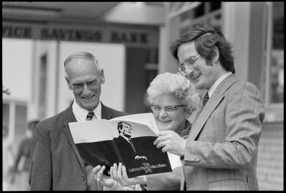 Date11 November 1975Reference Numberphoto gcc-36678DescriptionTauranga Labour Party candidate, Mr Richard Hendry (right) shows a party policy book to Mr and Mrs G. C. Chappell. Published 11 November 1975FormatNegativePhysical Description35mm black-and-white negative (1/9)Photographer/CreatorBay of Plenty Times