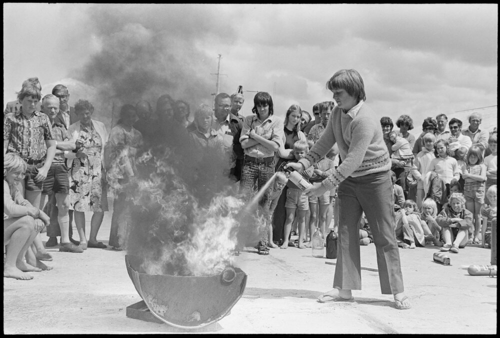 Date12 November 1975Reference Numberphoto gcc-36706DescriptionMr Bob Williams a fire prevention officer for the Tauranga United Fire Board, directs 13-year-old Lisa Fage who is using a dry powder fire extinguisher. The demonstration was part of a bigger one by the air and sea rescue division of the Tauranga police. Published 12 November 1975FormatNegativePhysical Description35mm black-and-white negative (6/15)Photographer/CreatorBay of Plenty Times