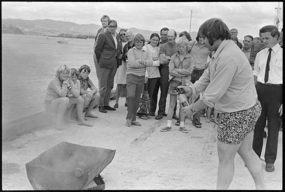 Date12 November 1975Reference Numberphoto gcc-36715DescriptionMr Bob Williams a fire prevention officer for the Tauranga United Fire Board, directs 13-year-old Lisa Fage who is using a dry powder fire extinguisher. The demonstration was part of a bigger one by the air and sea rescue division of the Tauranga police. Published 12 November 1975FormatNegativePhysical Description35mm black-and-white negative (15/15)Photographer/CreatorBay of Plenty Times