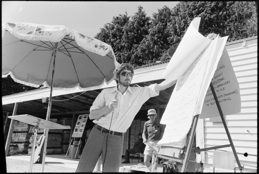 Date12 November 1975Reference Numberphoto gcc-36751DescriptionDr H. Wearing, of the Entomology Division of the DSIR, Auckland, who is heading a national leaf roller survey, speaking at a fruitgrowers field day, at a Te Puna orchard. Published 12 November 1975.FormatNegativePhysical Description35mm black-and-white negative (1/6)Photographer/CreatorBay of Plenty Times