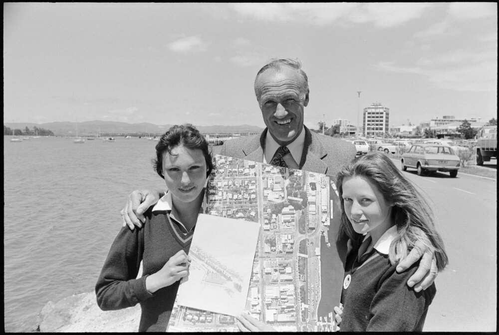 Date13 November 1975Reference Numberphoto gcc-36794DescriptionLooking at the aerial photograph of the site of the proposed regional arts and community centre on site are from left, Messrs Addison and Wills and Remonde Mackay and Amanda Entwistle. Published 13 November 1975.FormatNegativePhysical Description35mm black-and-white negative (9/11)Photographer/CreatorBay of Plenty Times