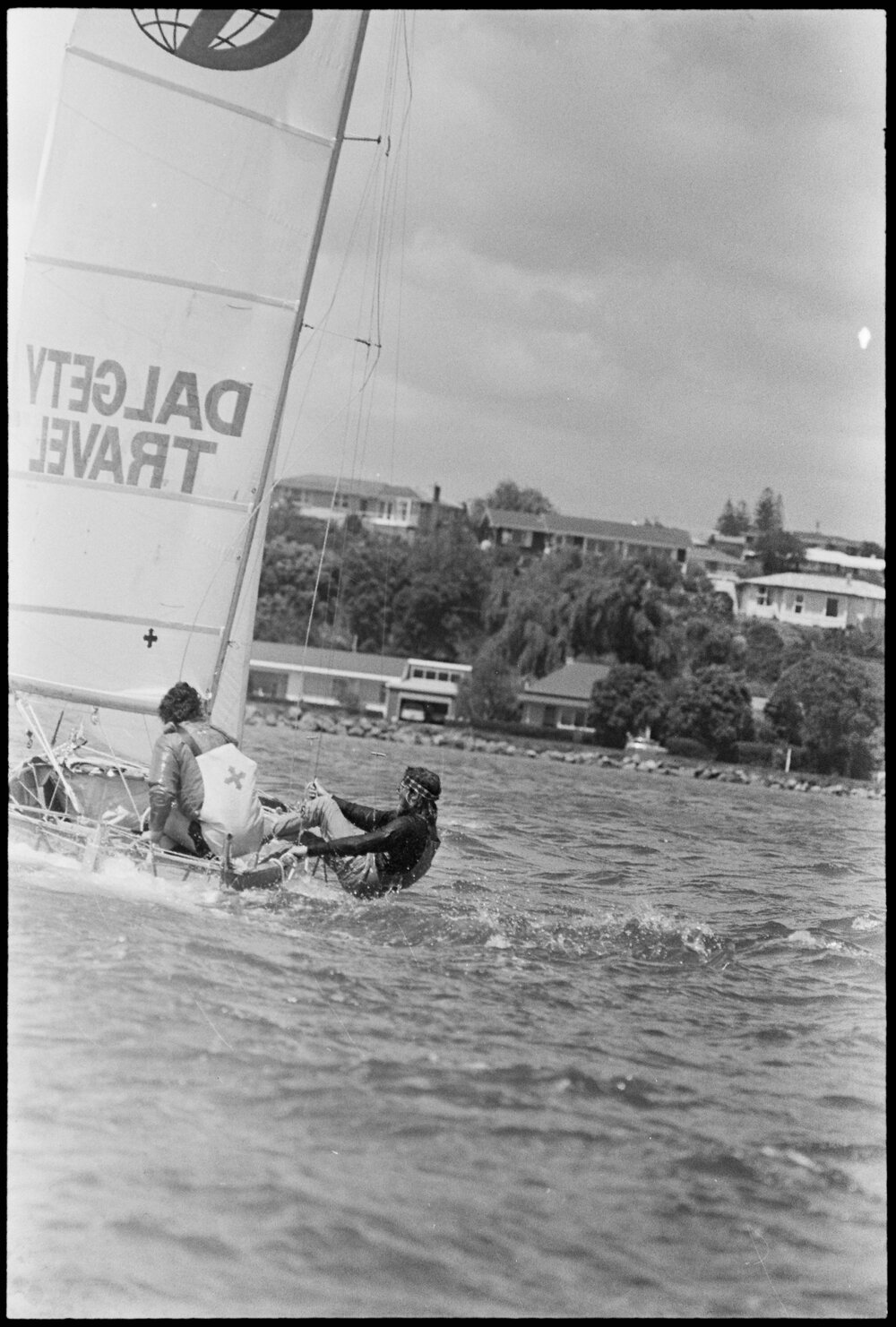 Date13 November 1975Reference Numberphoto gcc-36797DescriptionPaul Lowe and Graeme Jenkins taking the Q-class craft, Dalgety Travel, through her paces in her last Tauranga Yacht and Powerboat Club race before heading for the New Zealand Q-class trials at Auckland. Published 13 November 1975.FormatNegativePhysical Description35mm black-and-white negative (1/2)Photographer/CreatorBay of Plenty Times