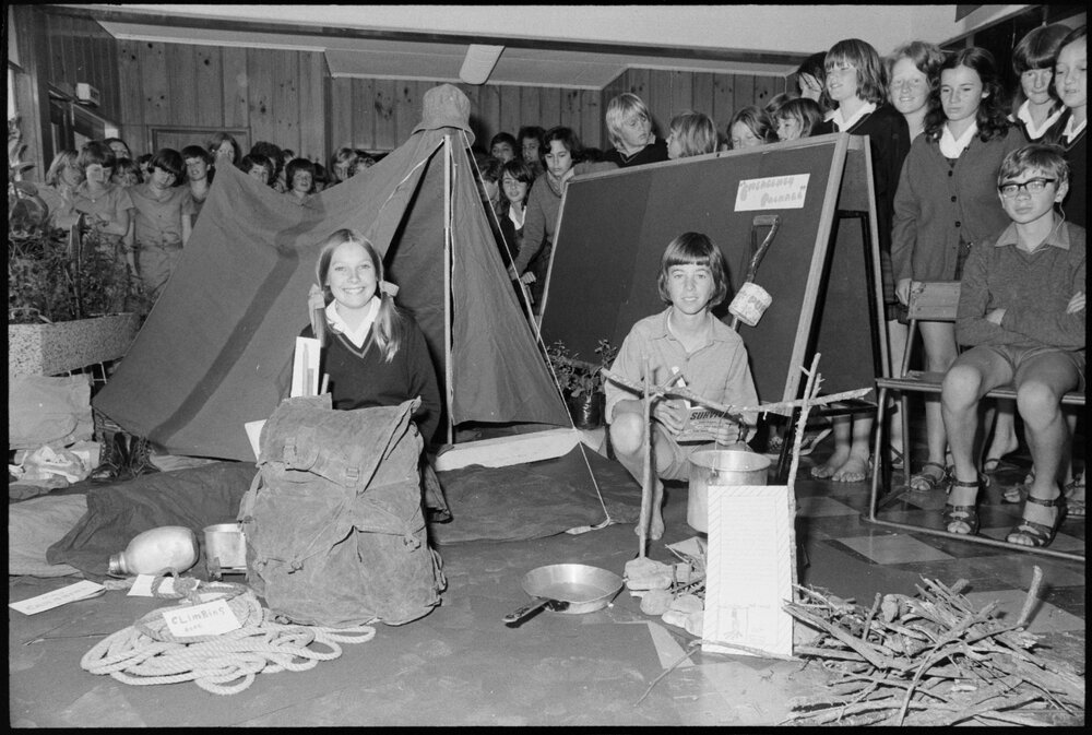 Date14 November 1975Reference Numberphoto gcc-36815DescriptionSchool display. Two Tauranga Intermediate School classes arranged a display centred around their camping week. 12-year-old Catherine Thornley with Russell Neilson. The school is looking for some local land to set-up an out-door centre. Published 14 November 1975.FormatNegativePhysical Description35mm black-and-white negative (1/8)Photographer/CreatorBay of Plenty Times