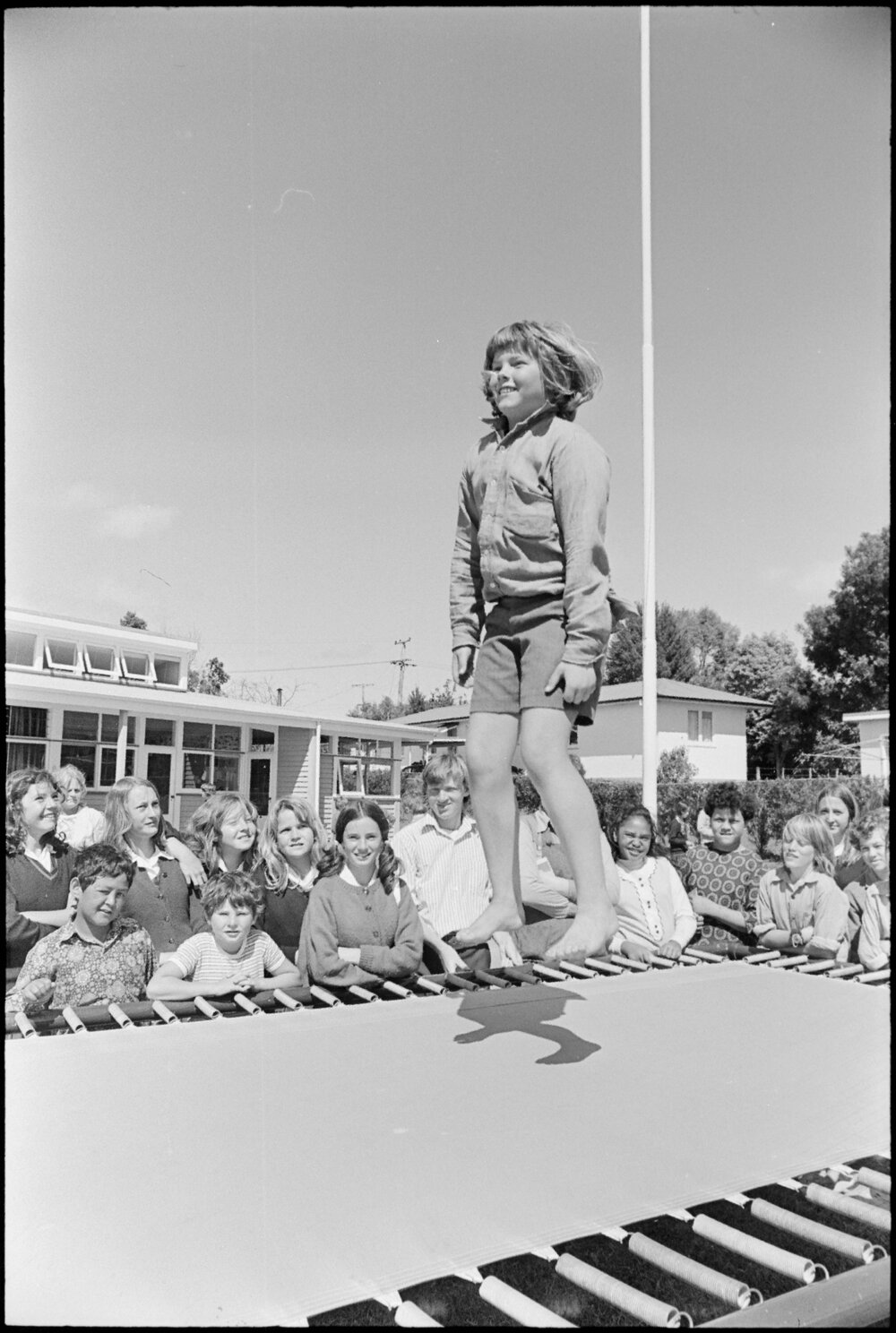 Date15 November 1975Reference Numberphoto gcc-36858DescriptionKevin Wenham enjoys the trampoline at the Kākā Street IHC School fair. Published 15 November 1975FormatNegativePhysical Description35mm black-and-white negative (4/6)Photographer/CreatorBay of Plenty Times