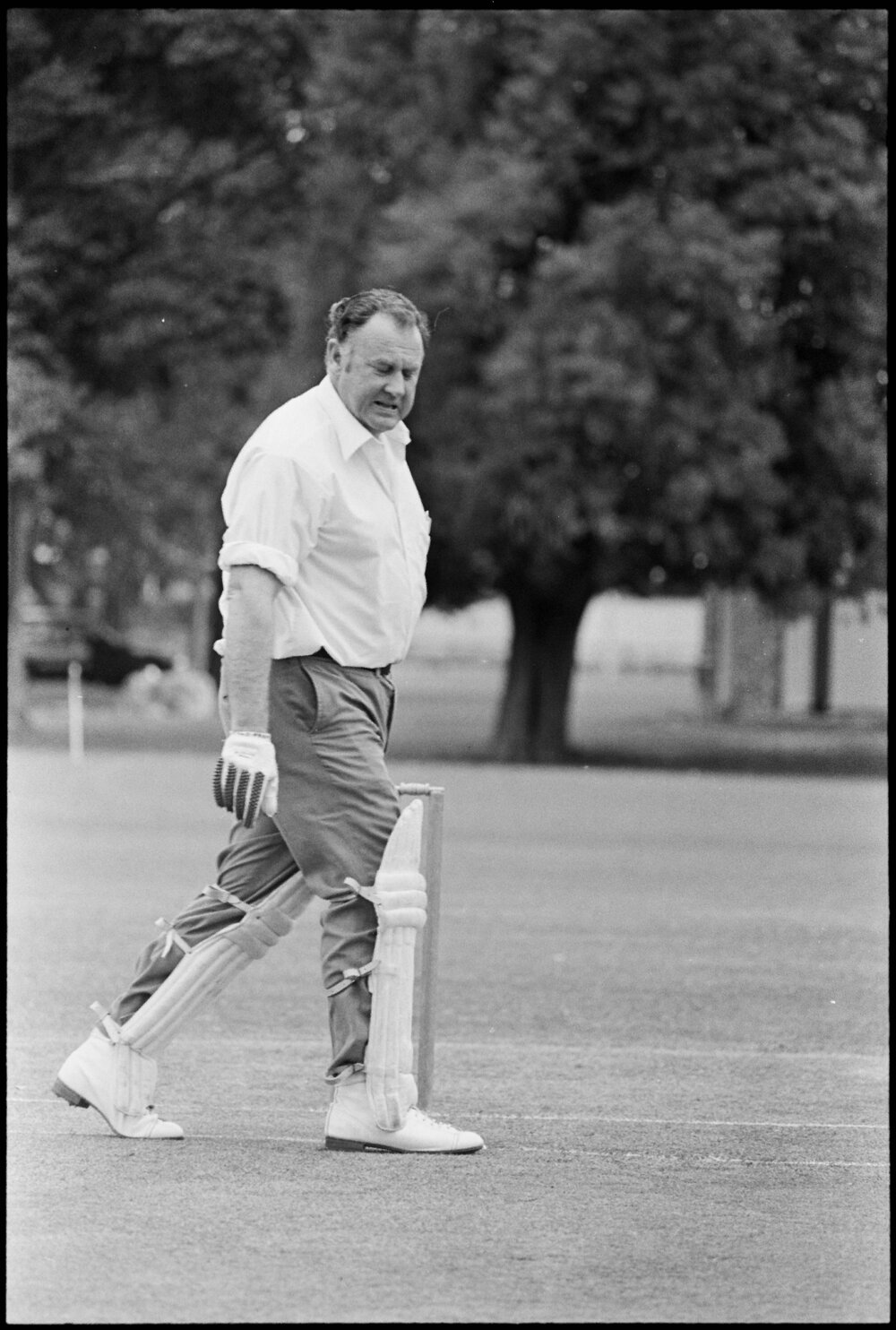 Date15 November 1975Reference Numberphoto gcc-36875DescriptionClergymen and laymen participating in Holy Trinity (Angels), v. the Rest (Demons) cricket match as part of the church's centennial celebrations. Batting is Mr K. R. Allen, National Party M.P. for Tauranga, and fielding is Bishop of Waiapu Paul Reeves. Published 15 November 1975.FormatNegativePhysical Description35mm black-and-white negative (4/8)Photographer/CreatorBay of Plenty Times