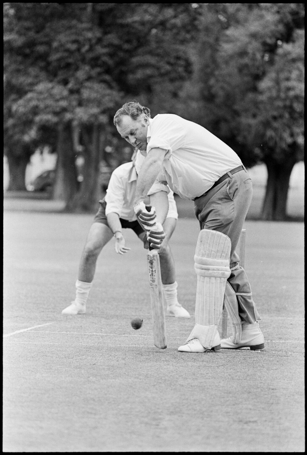 Date15 November 1975Reference Numberphoto gcc-36876DescriptionClergymen and laymen participating in Holy Trinity (Angels), v. the Rest (Demons) cricket match as part of the church's centennial celebrations. Batting is Mr K. R. Allen, National Party M.P. for Tauranga, and fielding is Bishop of Waiapu Paul Reeves. Published 15 November 1975.FormatNegativePhysical Description35mm black-and-white negative (5/8)Photographer/CreatorBay of Plenty Times