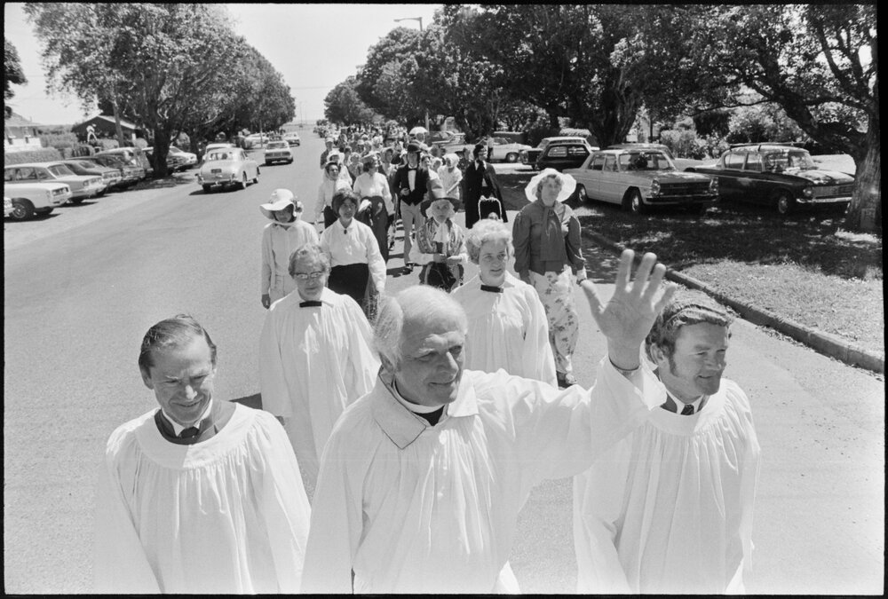 Date17 November 1975Reference Numberphoto gcc-36900DescriptionMr Trindall (foreground) leads the Parade of Witness along Cameron Road with the people's warden, Mr R. Banyard, at his side. Behind them are Mrs. N. F. Salmon (left) and Mrs D. Reader. Organised by the Holy Trinity Church. Published 17 November 1975.FormatNegativePhysical Description35mm black-and-white negative (1/3)Photographer/CreatorBay of Plenty Times
