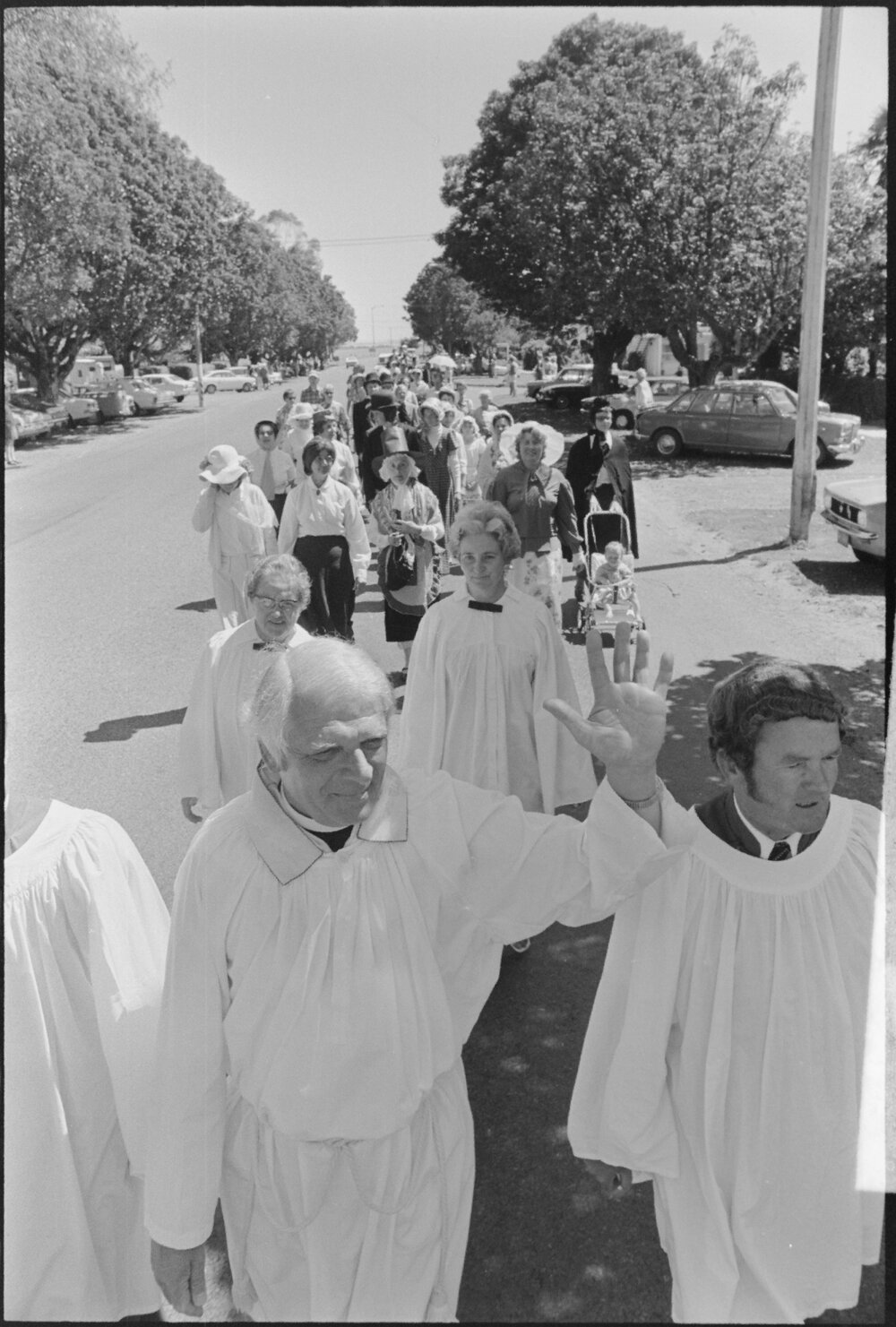 Date17 November 1975Reference Numberphoto gcc-36901DescriptionMr Trindall (foreground) leads the Parade of Witness along Cameron Road with the people's warden, Mr R. Banyard, at his side. Behind them are Mrs. N. F. Salmon (left) and Mrs D. Reader. Organised by the Holy Trinity Church. Published 17 November 1975.FormatNegativePhysical Description35mm black-and-white negative (2/3)Photographer/CreatorBay of Plenty Times