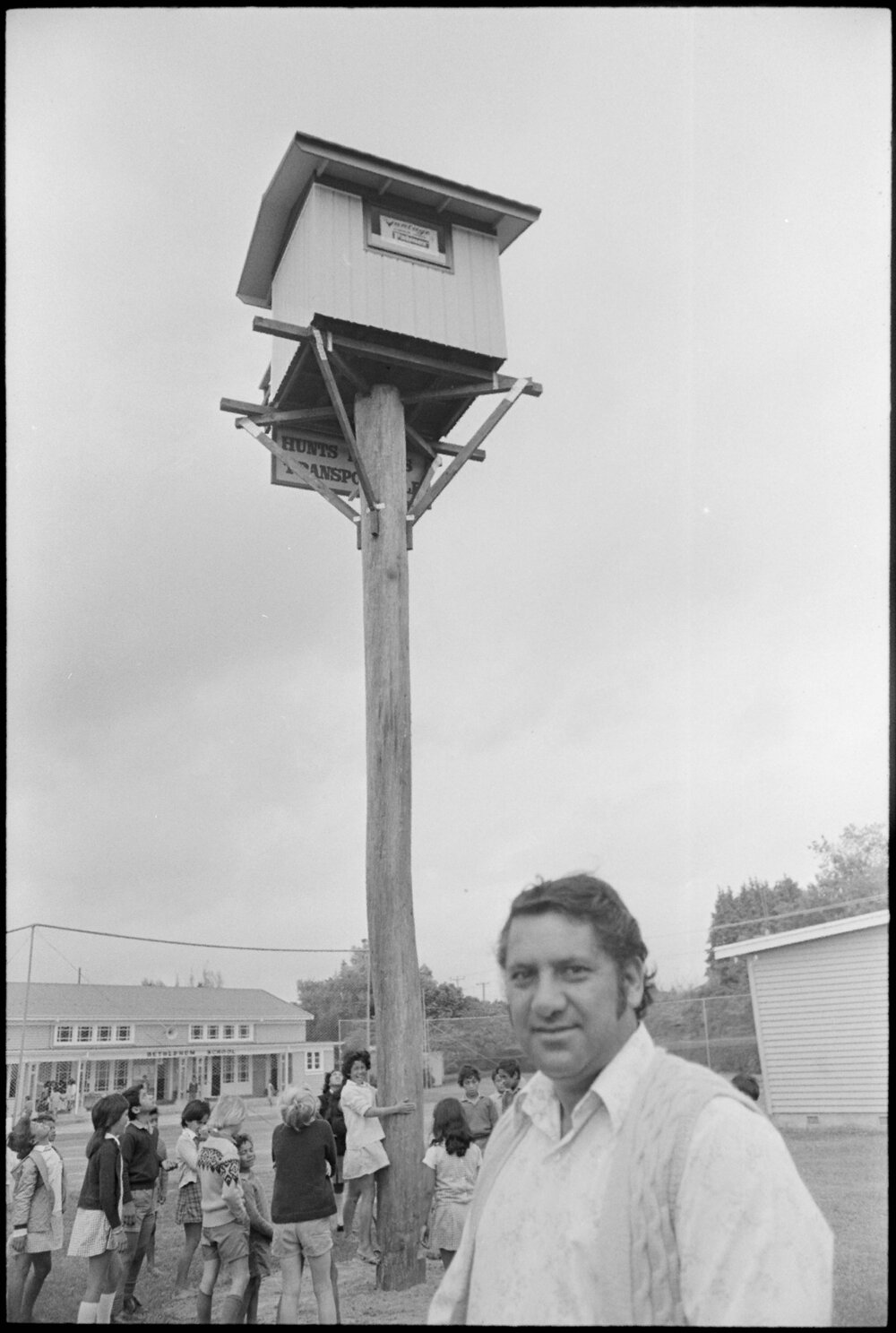 Date17 November 1975Reference Numberphoto gcc-36903DescriptionBethlehem School deputy principal, Mr C. B. Tutaki with the tiny playhouse on a pole that he will be sponsored to stay in for 24 hours for fundraising for the school. Published 17 November 1975FormatNegativePhysical Description35mm black-and-white negative (1/7)Photographer/CreatorBay of Plenty Times
