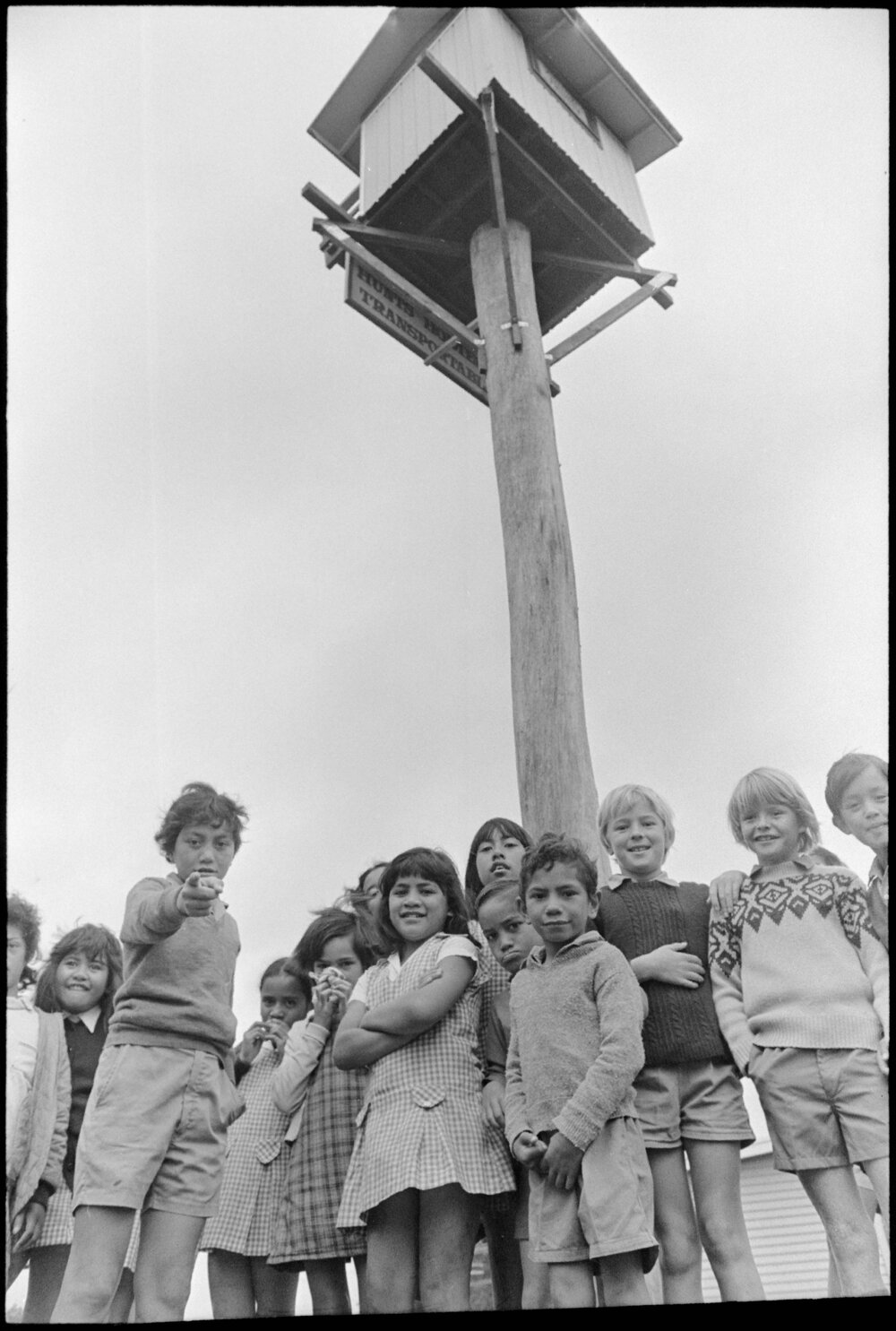 Date17 November 1975Reference Numberphoto gcc-36906DescriptionBethlehem School deputy principal, Mr C. B. Tutaki with the tiny playhouse on a pole that he will be sponsored to stay in for 24 hours for fundraising for the school. Published 17 November 1975FormatNegativePhysical Description35mm black-and-white negative (4/7)Photographer/CreatorBay of Plenty Times
