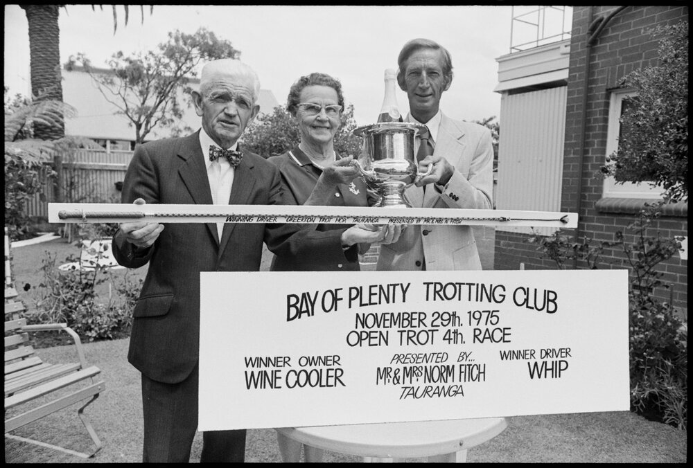 Date19 November 1975Reference Numberphoto gcc-36936DescriptionMr N. Robson (right), President of the Bay of Plenty Trotting Club, admires the wine cooler and whip given by Mr and Mrs Fitch as trophies for the Greerton Trot at the Bay of Plenty Trotting Club's meeting in Tauranga on Saturday week. Racing. Published 19 November 1975FormatNegativePhysical Description35mm black-and-white negative (1/6)Photographer/CreatorBay of Plenty Times