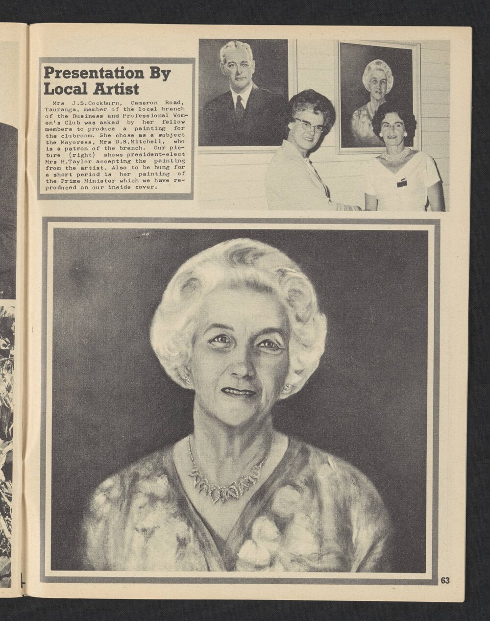 In February 1963 there were 86 local members and they were known as the Tauranga branch of the International Federation of Business and Professional Women's Club. In April that year member Mrs J.S. Cockburn produced a painting for the clubroom of Mayoress, Mrs D.S. Mitchell, then patron of the branch.