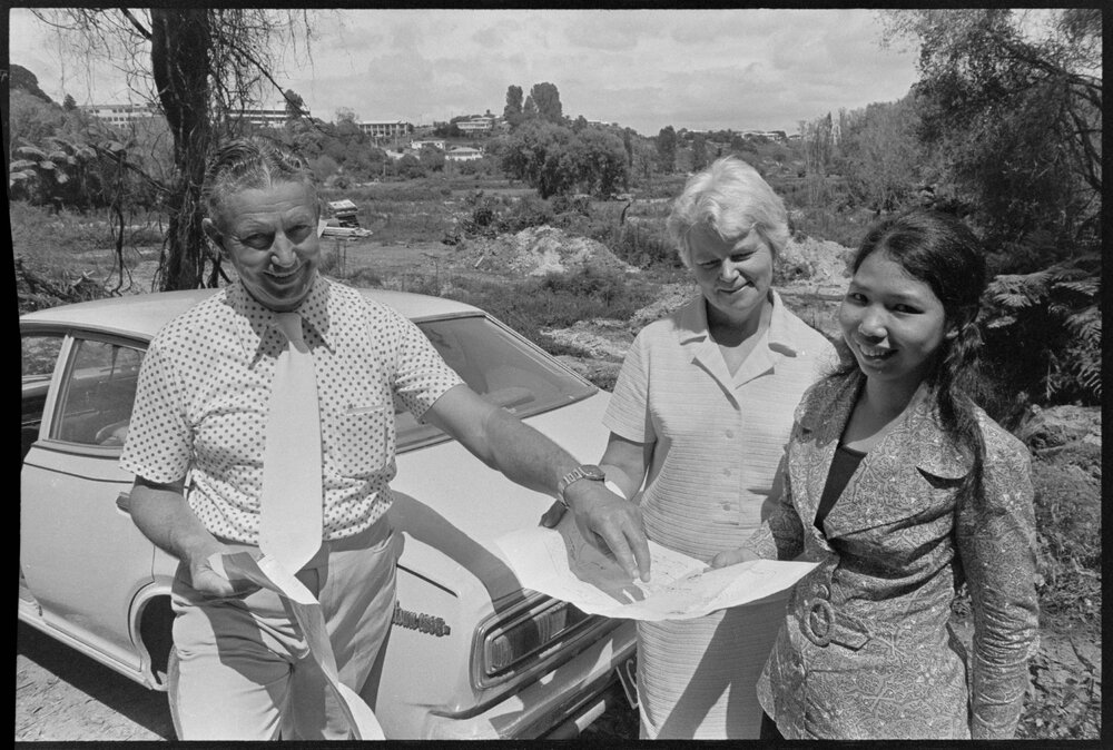Date18 February 1974Reference Numberphoto gcc-24737DescriptionN. W. Nicholls (chairman of Tanganga District Museum Committee) and M. Pascoe (secretary) show plans for Pioneer Village to visitor Maneerat Thoum Chareon (assistant curator of ethnology at Bangkok Museum). Published 18 February 1974.FormatNegativePhysical Description35mm black-and-white negative (1/3)Photographer/CreatorBay of Plenty Times