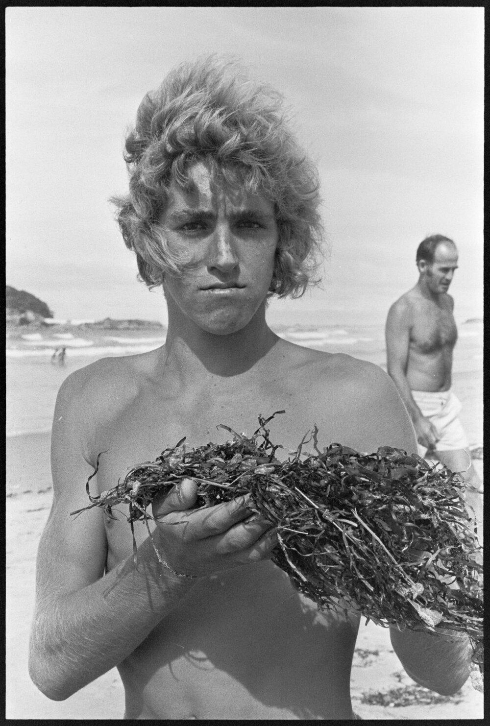 Date20 February 1974Reference Numberphoto gcc-24772Description16-year-old Barry Stanbridge holds seaweed full of small blue-bottle jellyfish, washed-up on Mount Maunganui beach. Not published.FormatNegativePhysical Description35mm black-and-white negative (3/3)Photographer/CreatorBay of Plenty Times