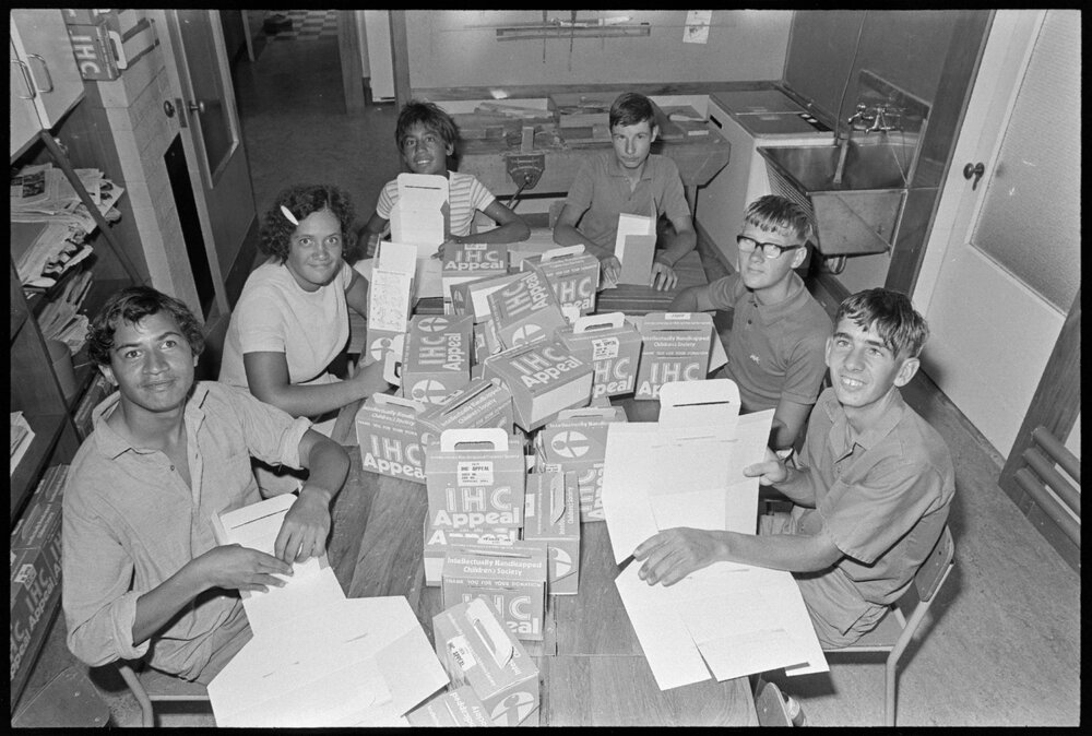 Date22 February 1974Reference Numberphoto gcc-24786DescriptionStudents from the Kākā Street Special School folded 250 boxes for the annual national IHC appeal in Tauranga. Published 22 February 1974.FormatNegativePhysical Description35mm black-and-white negative (2/3)Photographer/CreatorBay of Plenty Times