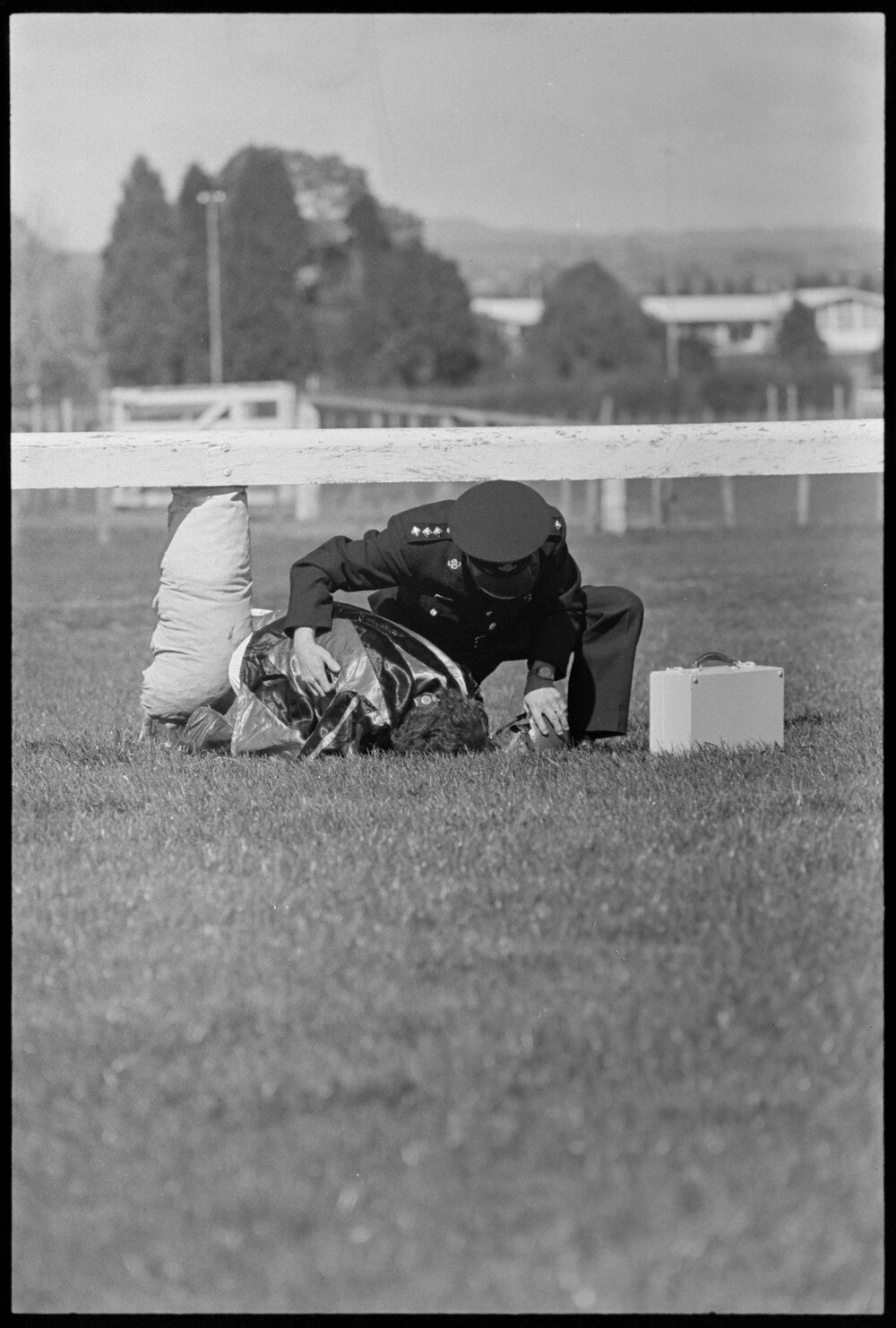 Date28 August 1974Reference Numberphoto gcc-24839DescriptionRider thrown from horse during Kaimai Hurdles race. Not published.FormatNegativePhysical Description35mm black-and-white negative (8/8)Photographer/CreatorBay of Plenty Times