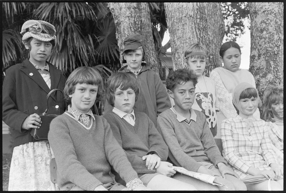 Date29 August 1974Reference Numberphoto gcc-24852DescriptionGroup of children dressed up, pose for photo. Not published. FormatNegativePhysical Description35mm black-and-white negative (3/3)Photographer/CreatorBay of Plenty Times