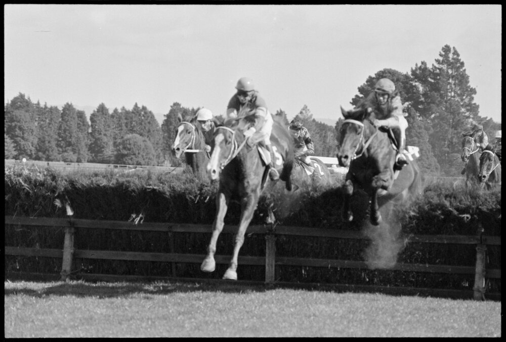 Date29 August 1974Reference Numberphoto gcc-24853DescriptionCup Day Steeples entrants, in action. Not published.FormatNegativePhysical Description35mm black-and-white negative (1/3)Photographer/CreatorBay of Plenty Times