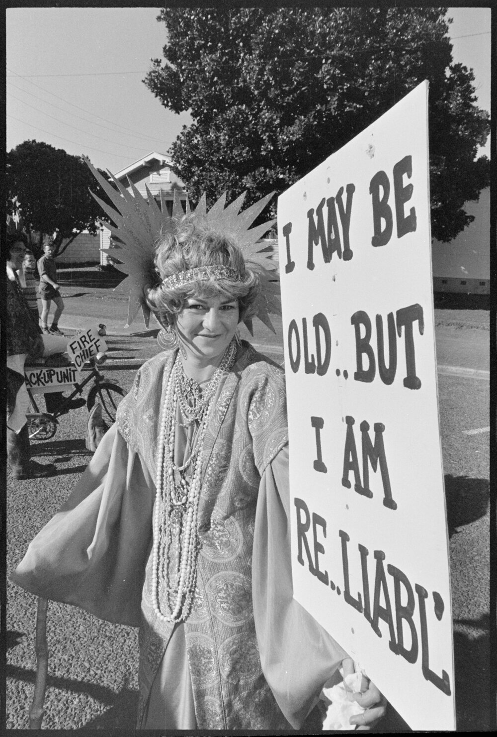 Date31 August 1974Reference Numberphoto gcc-24890DescriptionUnidentified woman in costume, at the Orange Festival float parade. Not published.FormatNegativePhysical Description35mm black-and-white negative (3/3)Photographer/CreatorBay of Plenty Times