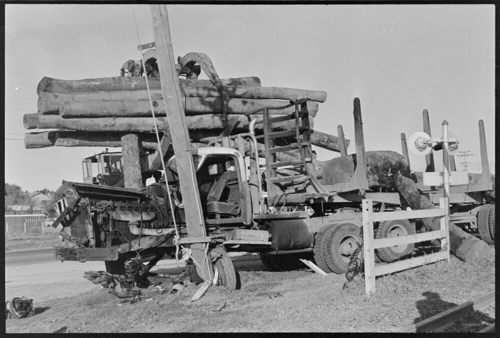 Date31 August 1974Reference Numberphoto gcc-24915DescriptionLumberjack clears logs after a logging truck collided with a train, at the Hewletts Rd level crossing, Mount Maunganui. Not published.FormatNegativePhysical Description35mm black-and-white negative (4/21)Photographer/CreatorBay of Plenty Times