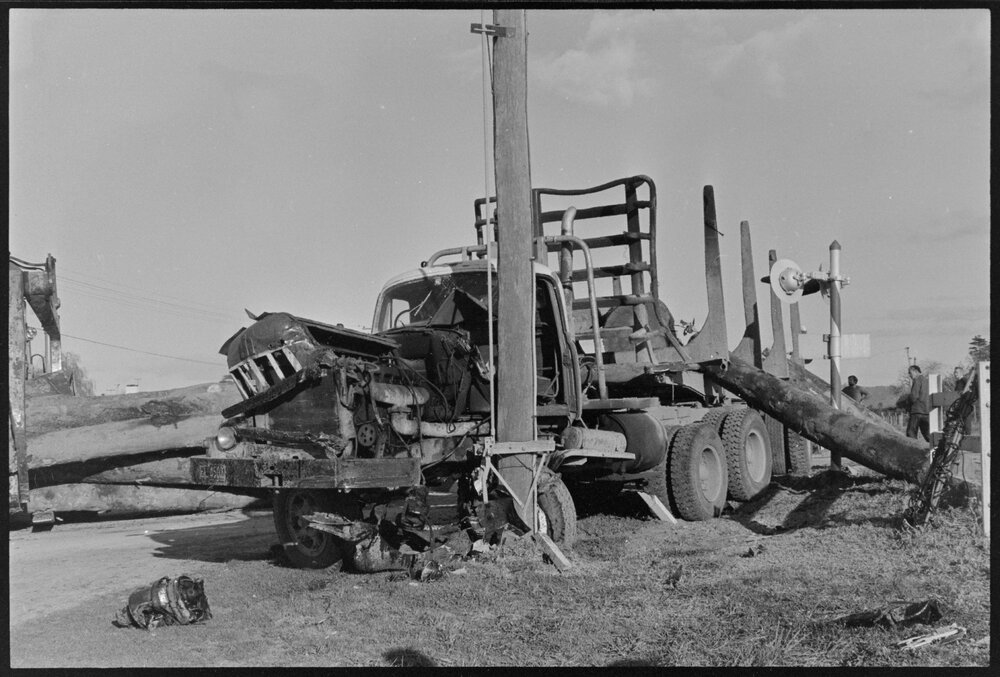 Date31 August 1974Reference Numberphoto gcc-24918DescriptionLogging truck after it collided with a train, at the Hewletts Rd level crossing, Mount Maunganui. Not published.FormatNegativePhysical Description35mm black-and-white negative (7/21)Photographer/CreatorBay of Plenty Times