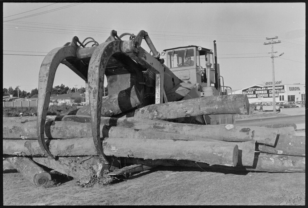 Date31 August 1974Reference Numberphoto gcc-24920DescriptionLumberjack clears logs after a logging truck collided with a train, at the Hewletts Rd level crossing, Mount Maunganui. Not published.FormatNegativePhysical Description35mm black-and-white negative (9/21)Photographer/CreatorBay of Plenty Times