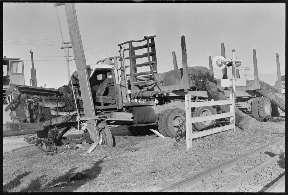 Date31 August 1974Reference Numberphoto gcc-24932DescriptionLogging truck after it collided with a train, at the Hewletts Rd level crossing, Mount Maunganui. Not published.FormatNegativePhysical Description35mm black-and-white negative (21/21)Photographer/CreatorBay of Plenty Times