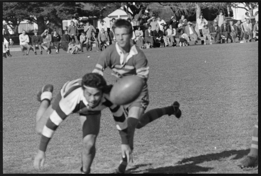 Date3 September 1974Reference Numberphoto gcc-24950DescriptionRugby match - Tauranga verses Ōpōtiki, at Tauranga Domain. Not published.FormatNegativePhysical Description35mm black-and-white negative (1/3)Photographer/CreatorBay of Plenty Times