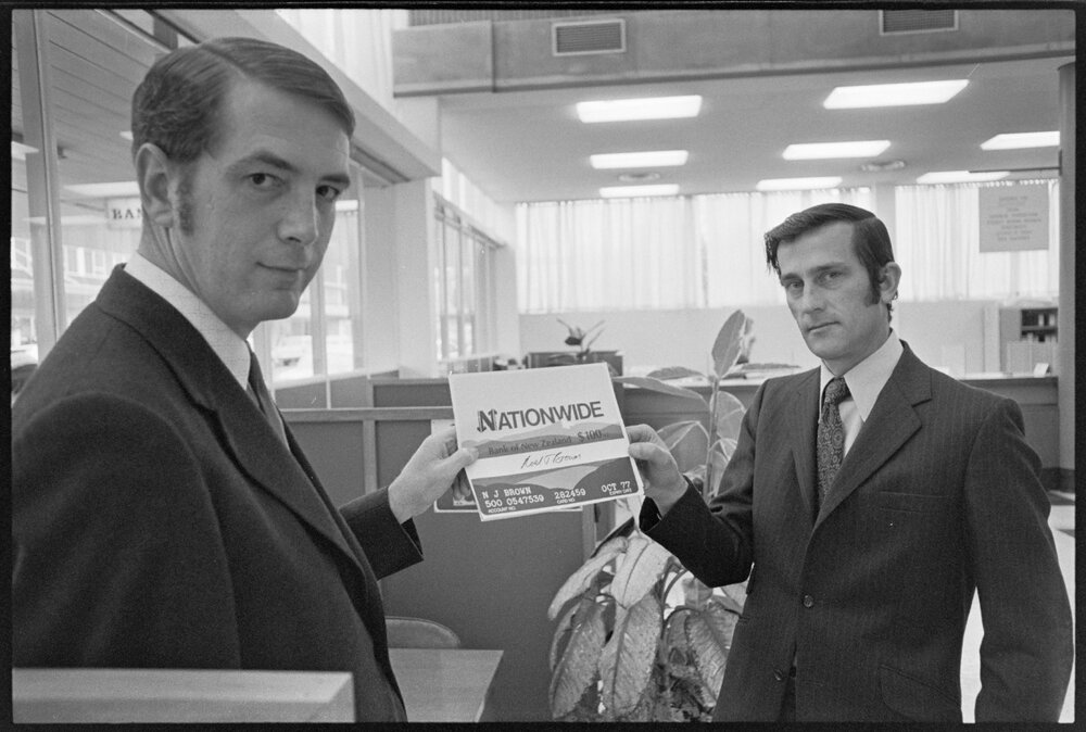 Date3 September 1974Reference Numberphoto gcc-24996DescriptionR. J. Edmonds (Tauranga's Bank of New Zealand manager, left) and D. L. McGowan (assistant manager) show a pamphlet detailing the new "Nationwide Account" banking service. Published 3 September 1974.FormatNegativePhysical Description35mm black-and-white negative (9/9)Photographer/CreatorBay of Plenty Times