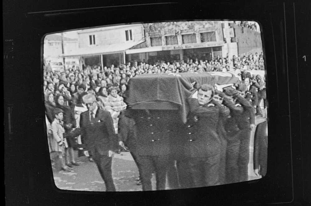 Date4 September 1974Reference Numberphoto gcc-25008DescriptionLate Prime Minister Normal Kirk's funeral, photograph of television broadcast. Police pallbearers carry coffin into St Paul's Cathedral, Wellington. Not published.FormatNegativePhysical Description35mm black-and-white negative (7/12)Photographer/CreatorBay of Plenty Times