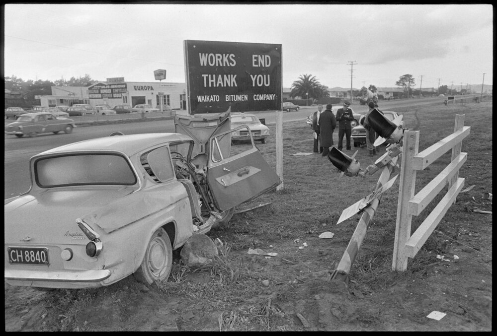 Date4 September 1974Reference Numberphoto gcc-25015DescriptionCar hit by train at the Hewletts Road level crossing, Mount Maunganui. Not published.FormatNegativePhysical Description35mm black-and-white negative (2/9)Photographer/CreatorBay of Plenty Times