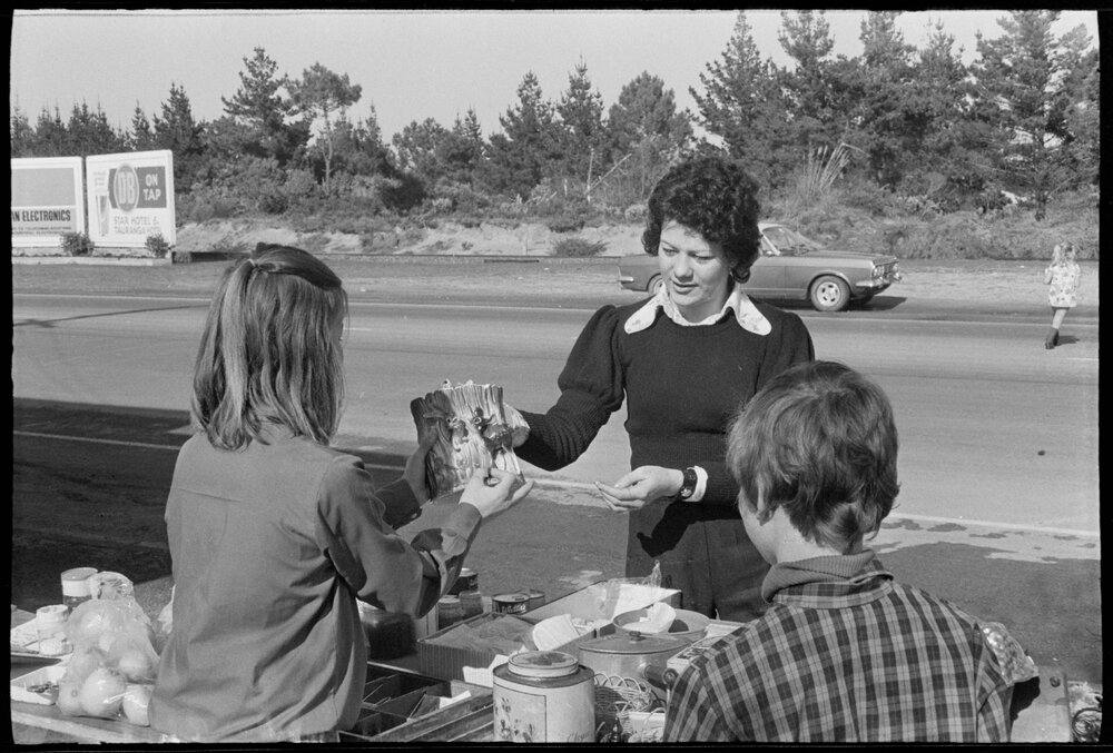 Date7 September 1974Reference Numberphoto gcc-25097DescriptionCharity sale in Central Parade, Mount Maunganui, raises money for the Crippled Children's Association. Pictured: Kay Findlay, aged 12, serving Helen Findlay (from Auckland). Not published.FormatNegativePhysical Description35mm black-and-white negative (3/6)Photographer/CreatorBay of Plenty Times