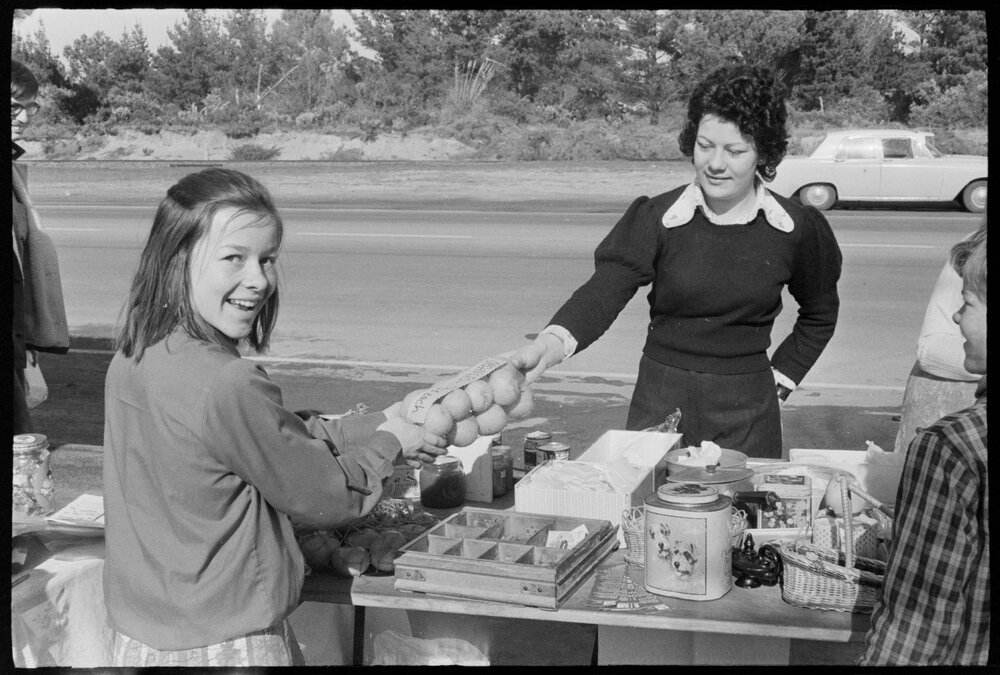 Date7 September 1974Reference Numberphoto gcc-25098DescriptionCharity sale in Central Parade, Mount Maunganui, raises money for the Crippled Children's Association. Pictured: Kay Findlay, aged 12, serving Helen Findlay (from Auckland). Not published.FormatNegativePhysical Description35mm black-and-white negative (4/6)Photographer/CreatorBay of Plenty Times