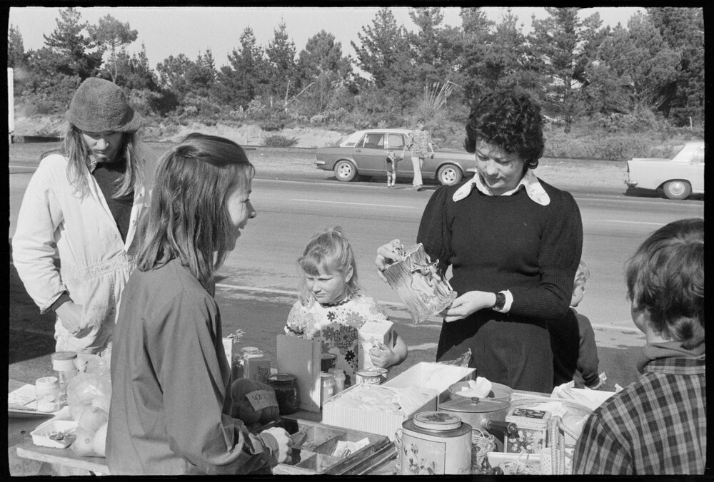 Date7 September 1974Reference Numberphoto gcc-25099DescriptionCharity sale in Central Parade, Mount Maunganui, raises money for the Crippled Children's Association. Pictured: Kay Findlay, aged 12, serving Helen Findlay (from Auckland). Published 7 September 1974.FormatNegativePhysical Description35mm black-and-white negative (5/6)Photographer/CreatorBay of Plenty Times