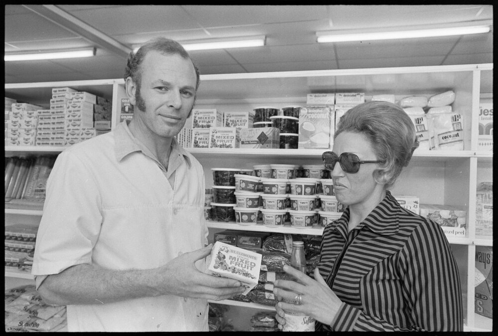 Date9 September 1974Reference Numberphoto gcc-25142DescriptionJohn Philpott, owner of Savemore supermarkets, and customer H. A. Edlington. Advertisement. Published 9 September 1974.FormatNegativePhysical Description35mm black-and-white negative (3/6)Photographer/CreatorBay of Plenty Times