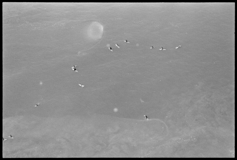 Date11 September 1974Reference Numberphoto gcc-25259DescriptionSurfers photographed from above. Not published. FormatNegativePhysical Description35mm black-and-white negative (4/9)Photographer/CreatorBay of Plenty Times