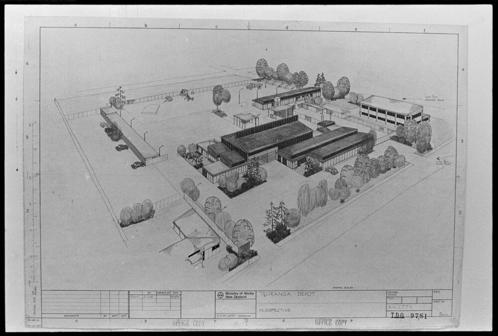Date11 September 1974Reference Numberphoto gcc-25265DescriptionArchitectural illustration of Greerton depot, shows how the site is expected to look once completed. Corner of Chadwick Road and Sheron Street. Published 11 September 1974.FormatNegativePhysical Description35mm black-and-white negative (1/5)Photographer/CreatorBay of Plenty Times