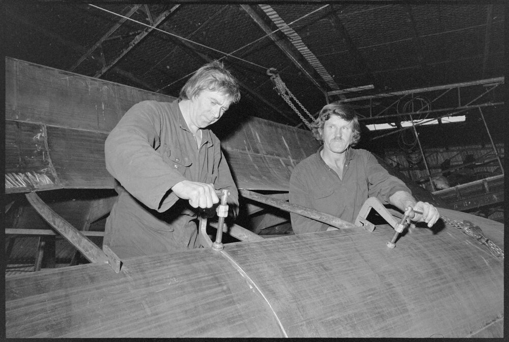 Date13 September 1974Reference Numberphoto gcc-25289DescriptionWin Ashmore (Managing Director of Bay of Plenty Steel Yachts, left), and David Braid (Business Partner, right), at work on a yacht in their temporary Pāpāmoa premises. Published 13 September 1974.FormatNegativePhysical Description35mm black-and-white negative (2/3)Photographer/CreatorBay of Plenty Times