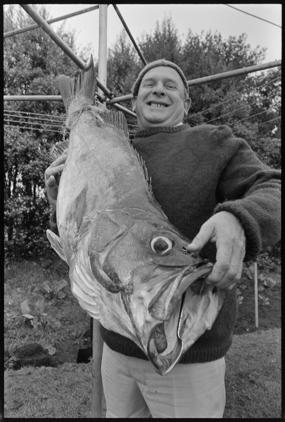 Date16 September 1974Reference Numberphoto gcc-25307DescriptionE. Ted Birt poses with catch - a 64lb 3oz Hāpuka (approximately 29 kilograms). Published 16 September 1974.FormatNegativePhysical Description35mm black-and-white negative (5/9)Photographer/CreatorBay of Plenty Times