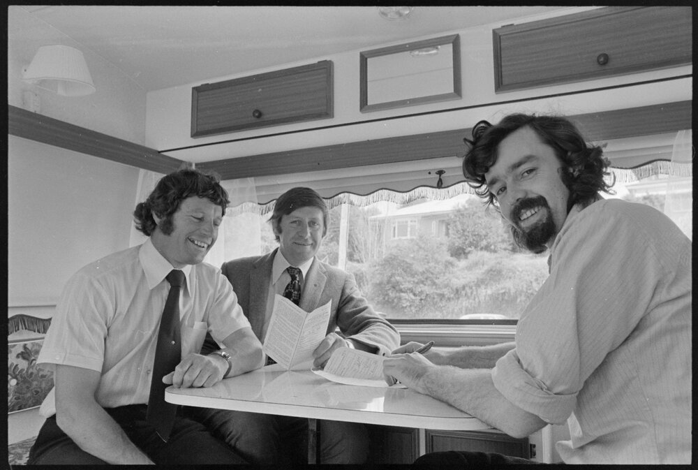Date18 September 1974Reference Numberphoto gcc-25415DescriptionPat Molloy signs ownership papers for new caravan, won in a charity competition organised by the Ōtūmoetai Lions Club. Pictured from left: Gary Ware (club president), Howard Lowe (project organiser), and Pat Molloy. Published 18 September 1974.FormatNegativePhysical Description35mm black-and-white negative (2/6)Photographer/CreatorBay of Plenty Times