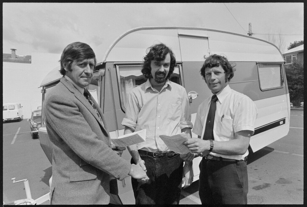Date18 September 1974Reference Numberphoto gcc-25418DescriptionPat Molloy signs ownership papers for new caravan, won in a charity competition organised by the Ōtūmoetai Lions Club. Pictured from left: Howard Lowe (project organiser), Pat Molloy, and Gary Ware (club president). Not published.FormatNegativePhysical Description35mm black-and-white negative (5/6)Photographer/CreatorBay of Plenty Times
