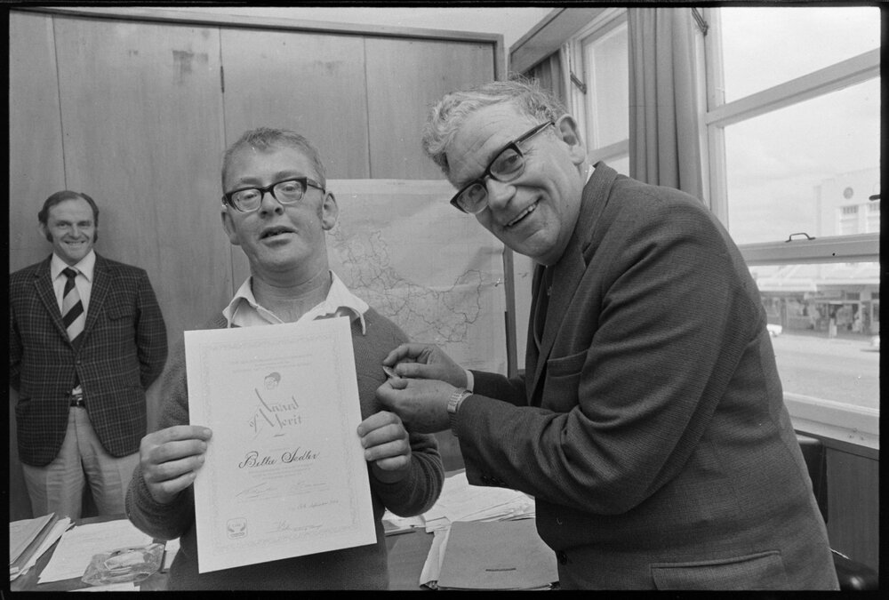 Date19 September 1974Reference Numberphoto gcc-25421DescriptionBill Sadler being presented with "Tidy Kiwi" badge and Certificate of Merit award by acting Mayor of Te Puke, F. McBeth. The award was made in recognition of Bill's efforts in keeping Jubilee Park tidy during the last four years. Published 19 September 1974.FormatNegativePhysical Description35mm black-and-white negative (2/3)Photographer/CreatorBay of Plenty Times