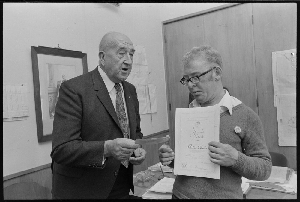 Date19 September 1974Reference Numberphoto gcc-25422DescriptionBill Sadler (right) receives "Tidy Kiwi" badge and Certificate of Merit award. The award was made in recognition of Bill's efforts in keeping Jubilee Park tidy during the last four years. Man pictured on left unidentified, possibly F. M. Antram, chairman of the Te Puke "I Care" Committee. Not published. FormatNegativePhysical Description35mm black-and-white negative (3/3)Photographer/CreatorBay of Plenty Times