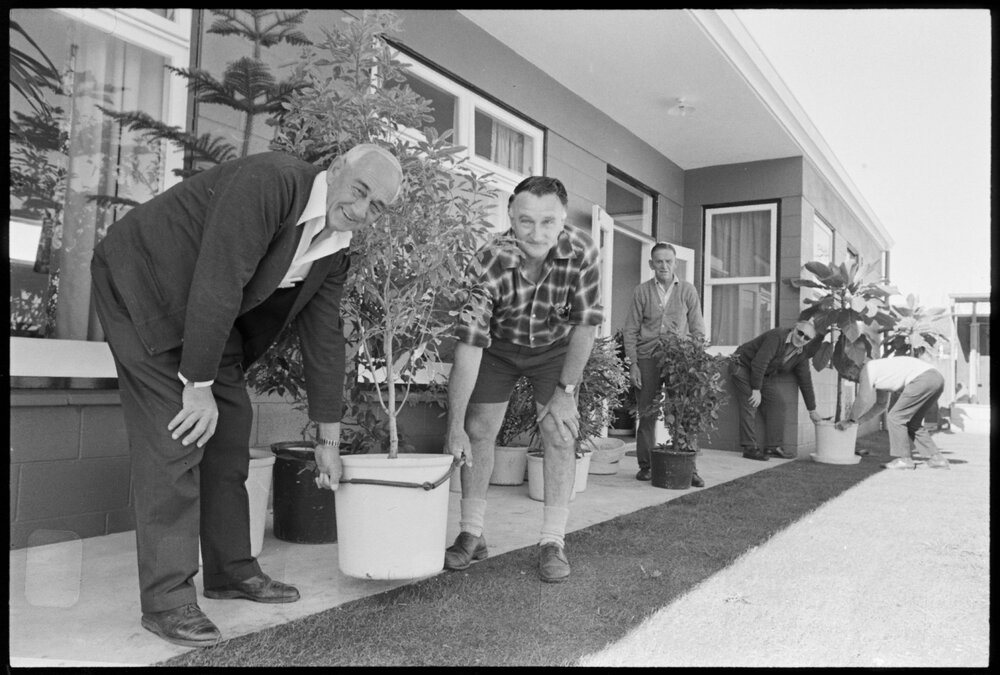 Date21 September 1974Reference Numberphoto gcc-25497DescriptionPutting final touches on the Tauranga RSA Bowling Club pavilion. Pictured are J. Graham (left), president of the club, and G. Lund, chairman of the building committee. Published 21 September 1974.FormatNegativePhysical Description35mm black-and-white negative (1/9)Photographer/CreatorBay of Plenty Times