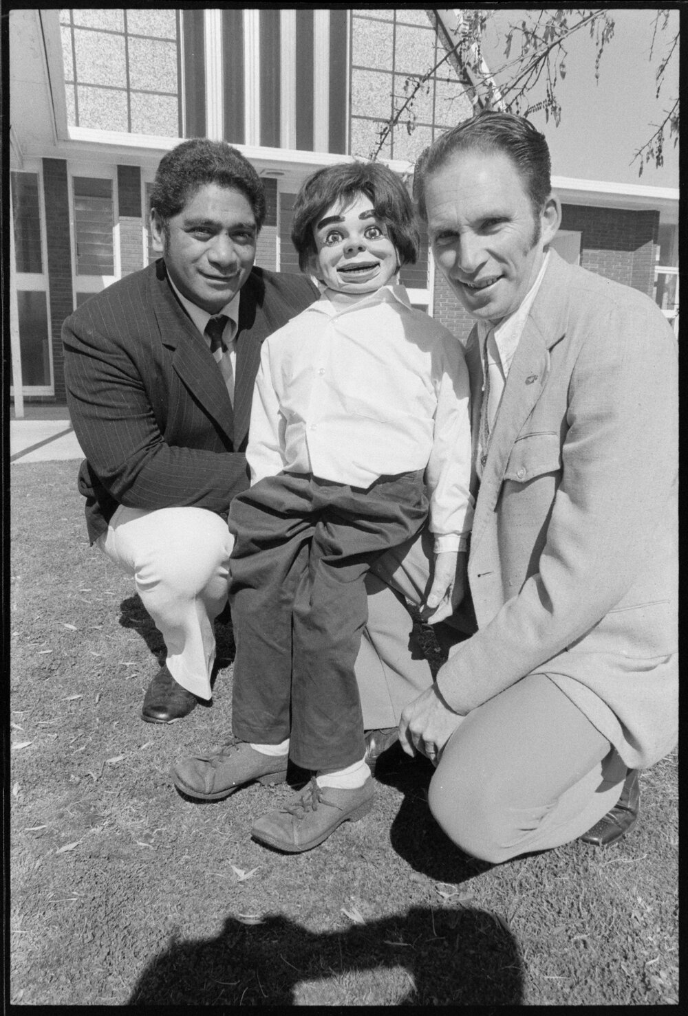 Ventriloquist Jim Muir, 'Charlie' the doll, and Bob Kingi (1 October 1974). Pae Korokī, accessed 07/04/2026, https://paekoroki.tauranga.govt.nz/nodes/view/112117