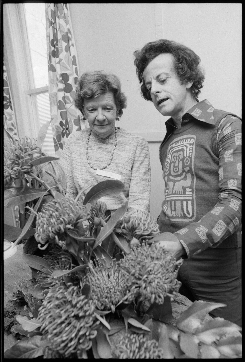 Date2 October 1974Reference Numberphoto gcc-25713DescriptionWeathered Wood complemented with Waratahs. M. Eddy (left) receives advice from floral art demonstrator Maurice August (right). Published 2 October 1974.FormatNegativePhysical Description35mm black-and-white negative (3/5)Photographer/CreatorBay of Plenty Times