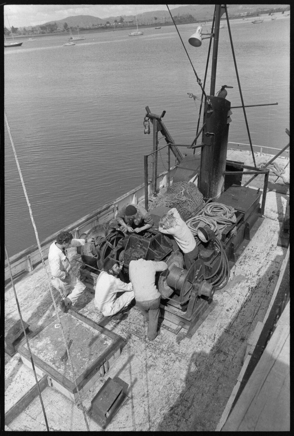 Date3 October 1974Reference Numberphoto gcc-25723DescriptionThe 'Proton' was towed back to Tauranga Harbour by 'The Edward G.', after it was seized with engine trouble 12 miles off Whale Island. Pictured: Proton crew members working on the engine. Not published.FormatNegativePhysical Description35mm black-and-white negative (4/6)Photographer/CreatorBay of Plenty Times