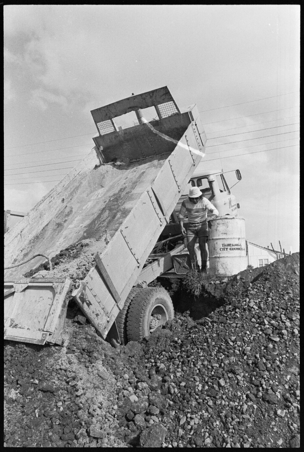 Date11 October 1974Reference Numberphoto gcc-25906DescriptionRoad side collapses during roadworks project. Pictured is truck driver Jim Foster. Not published.FormatNegativePhysical Description35mm black-and-white negative (3/6)Photographer/CreatorBay of Plenty Times